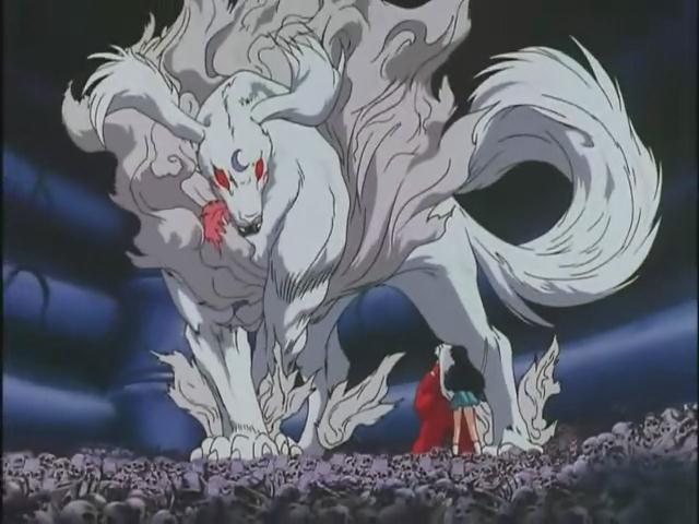 ANIMAL: Sesshomaru's other form is an oversized dog. The dog stands 7' tall at the shoulder and is the same silver color as Sesshomaru's hair, and the tail from his human form becomes a peachy-colored ruff around the dog's neck. The markings on his face are replicated on the dog's face, though the cheek markings coarsen and get ragged along the edges, and the red around his eyes disappears.
